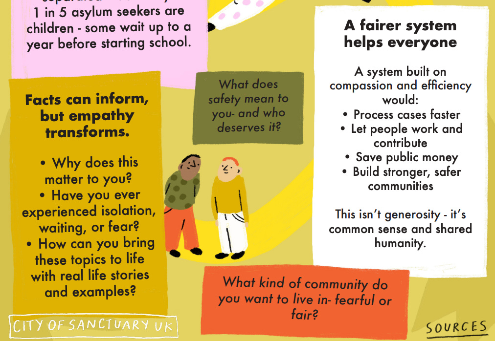 The Facts about Sanctuary provides clear, accessible information about people seeking sanctuary in the UK. But facts alone don’t change hearts and minds. This guide encourages you to bring your own thoughts, experiences, and humanity into the conversation – because connection is what truly transforms understanding.
