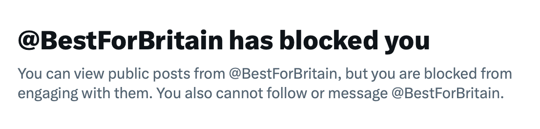 Not only has Best for Britain blocked me, but Iâve also been blocked by: