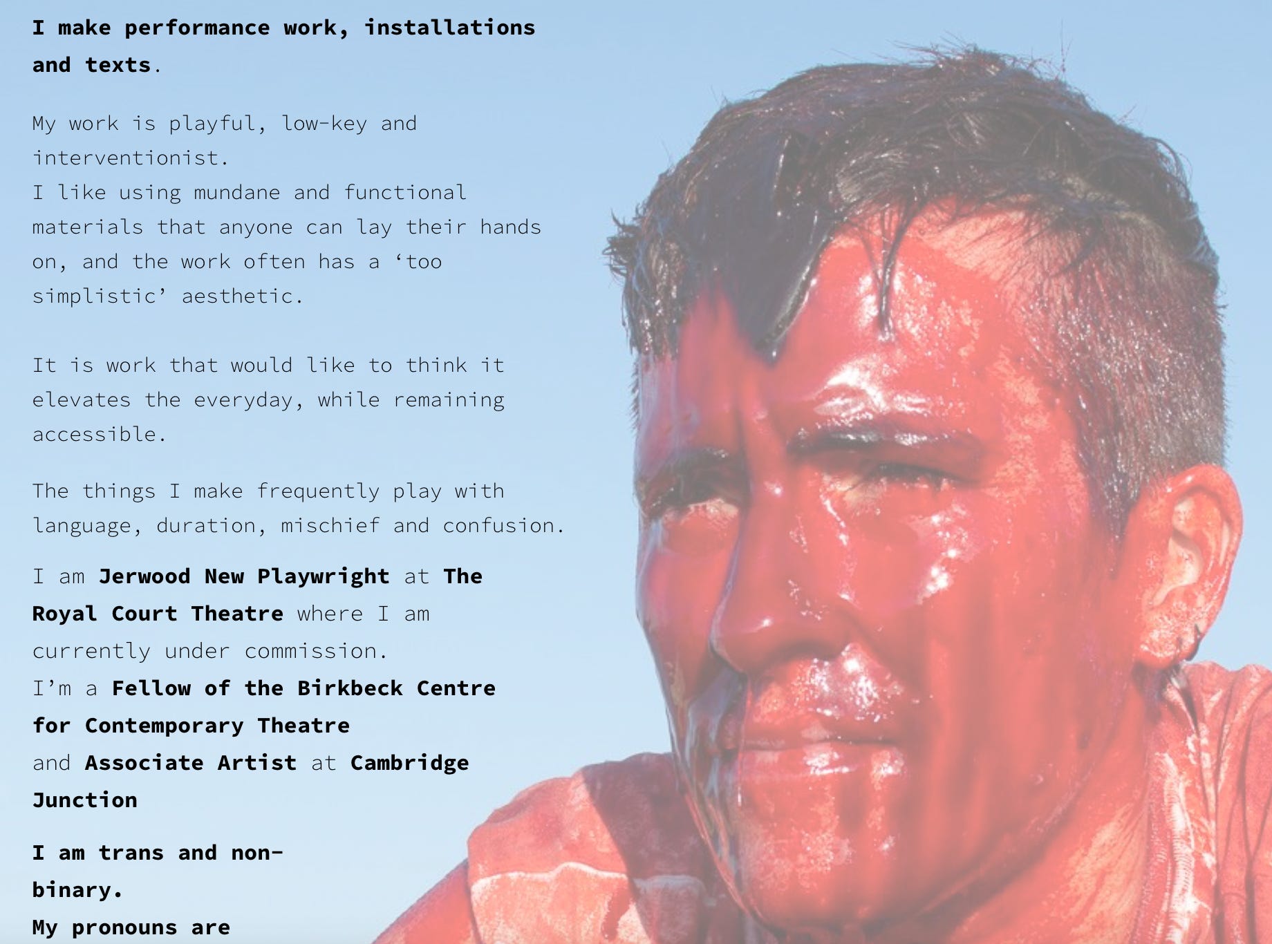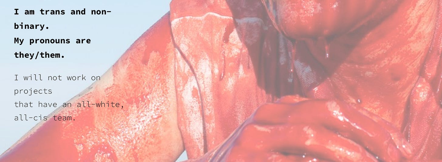 … and a biography, which spells out that “they” is none too keen on white cis types (who is these days?)