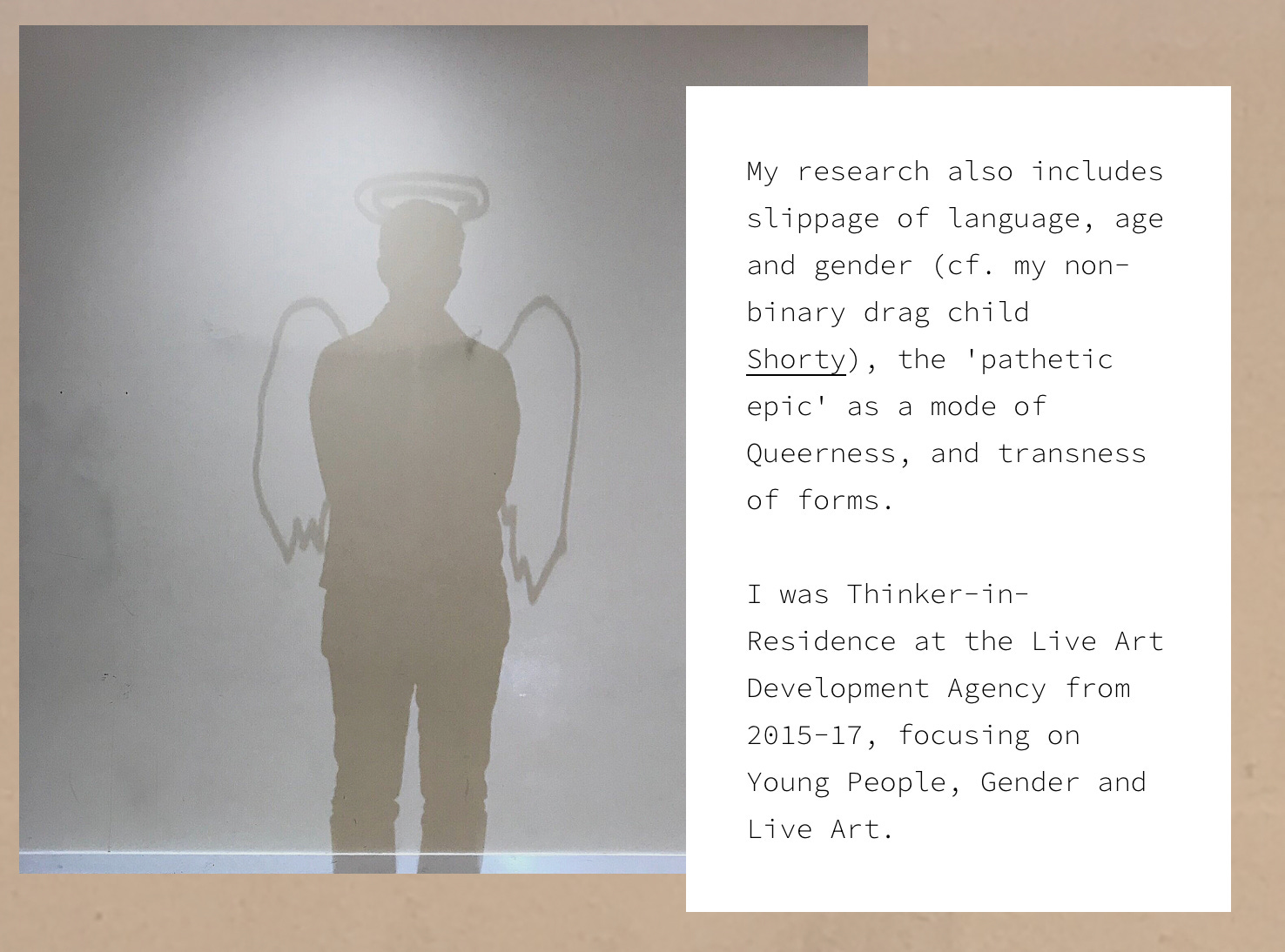 Chillingsworth’s research “includes slippage of language, age and gender (cf. my non-binary drag child Shorty), the 'pathetic epic' as a mode of Queerness, and transness of forms.”
