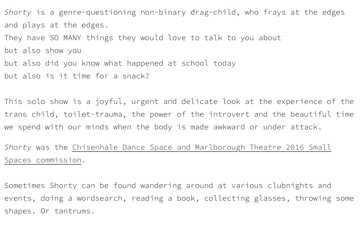 Shorty takes an “urgent and delicate look at the experience of the trans child” and “toilet-trauma”, among other areas; real issues of our time, I’m sure you will agree.