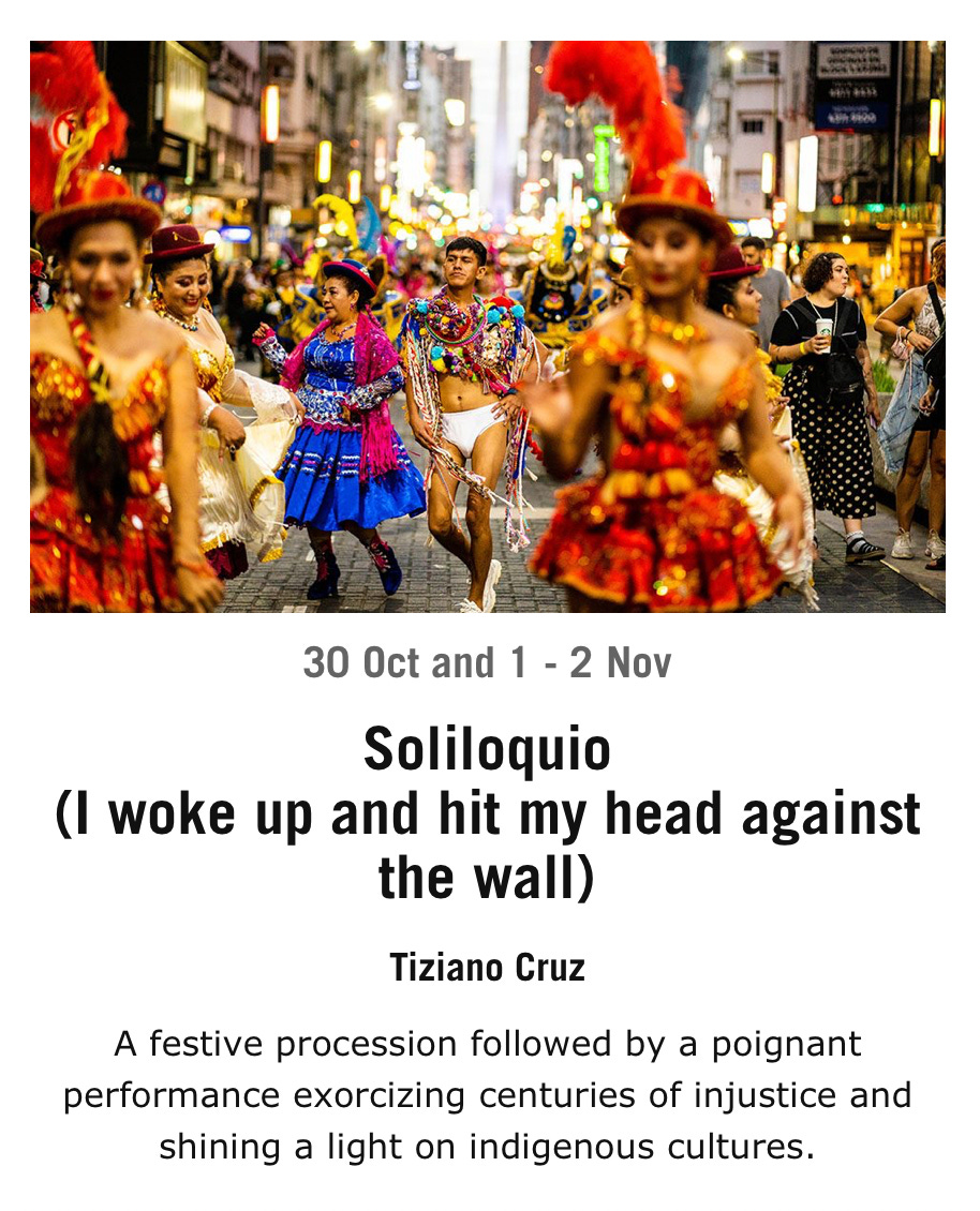 And what about upcoming Soliloquio, “A festive procession followed by a poignant performance exorcizing centuries of injustice and shining a light on indigenous cultures”?