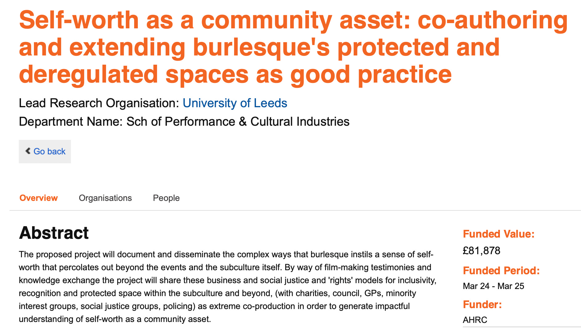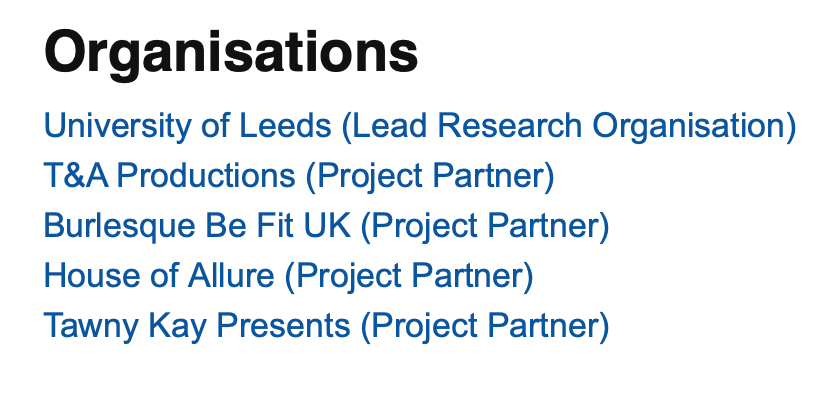 Project partners include Burlesque Be Fit UK and House of Allure, as well as other institutions.