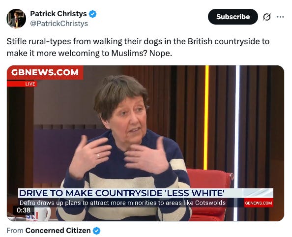 Earlier in February GB News commentator Scarlett MccGwire suggested âone of the problems is dogsâ when it comes to making the countryside more inclusive, before touching on âthe fact that a lot of Muslims find dogs very difficultâ. Clip here.