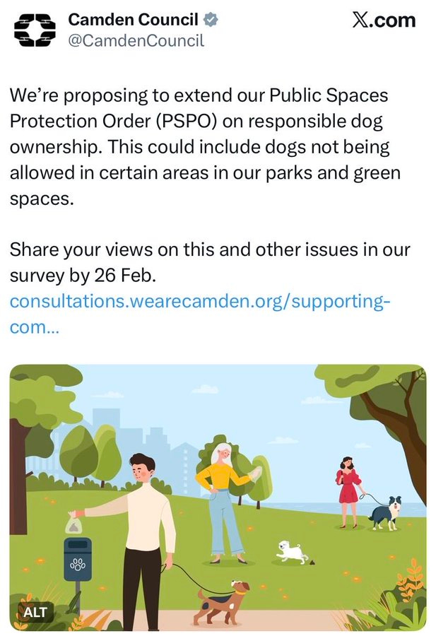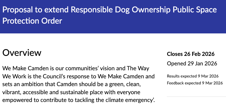 Yesterday, in a now-deleted tweet, Camden Council launched a consultation on âresponsible dog ownershipâ. The Council is proposing to extend its Public Spaces Protection Order, which could mean âdogs not being allowed in certain areas in [Camdenâs] parks and green spacesâ.
