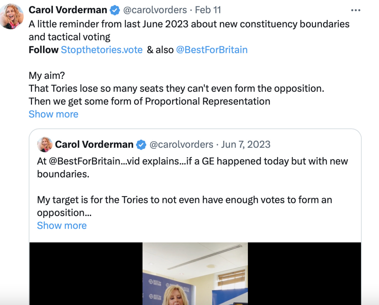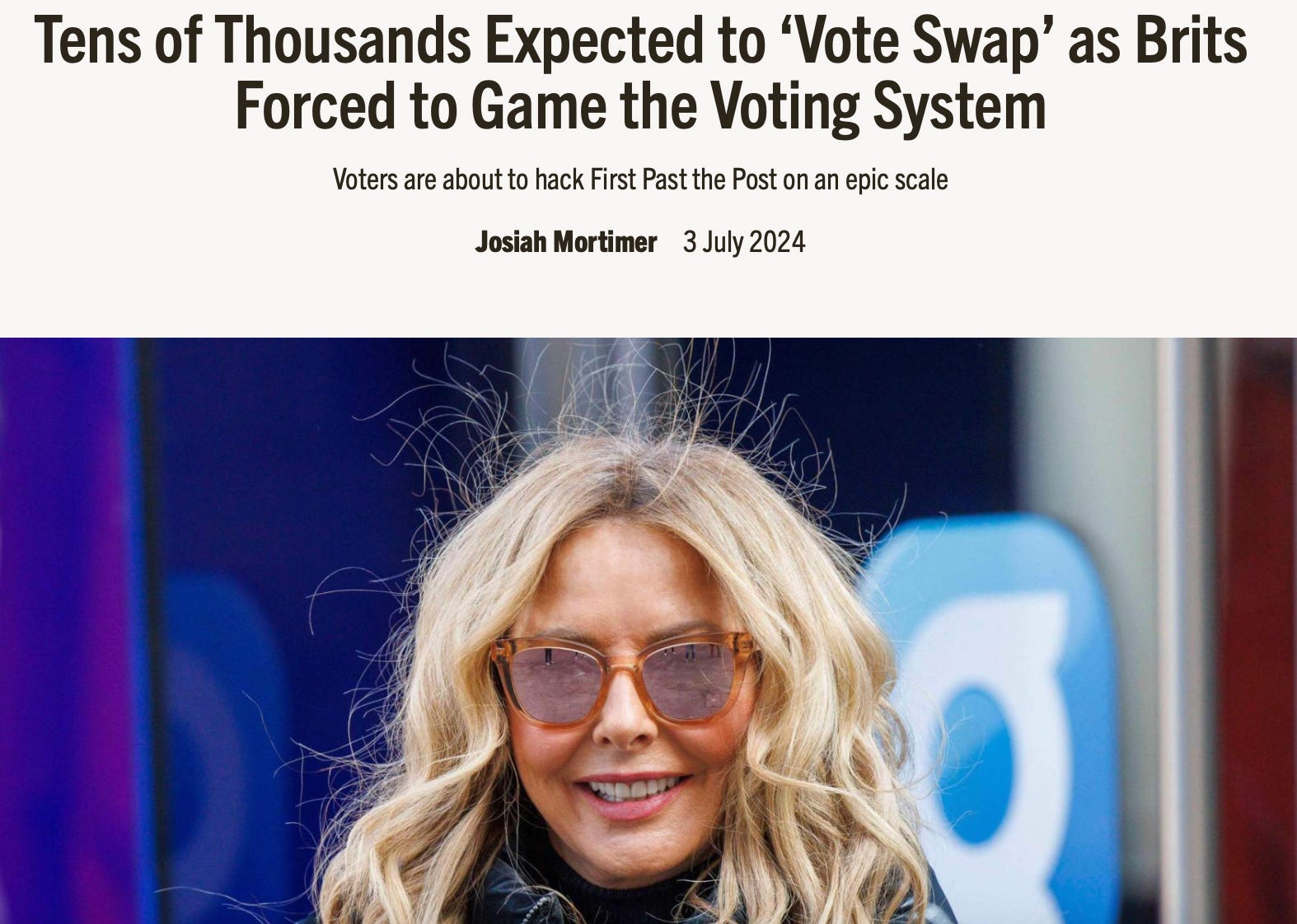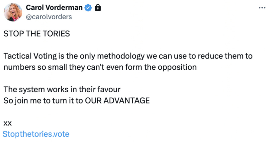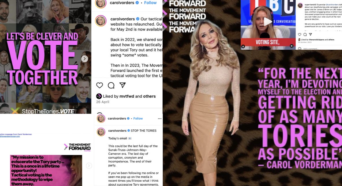 Media outfits that promoted Vorderman’s tactical voting initiatives include Byline Times, Politics Joe and The London Economic (the latter two being run by the same people, and all of them being heavy on Vorderman content.)