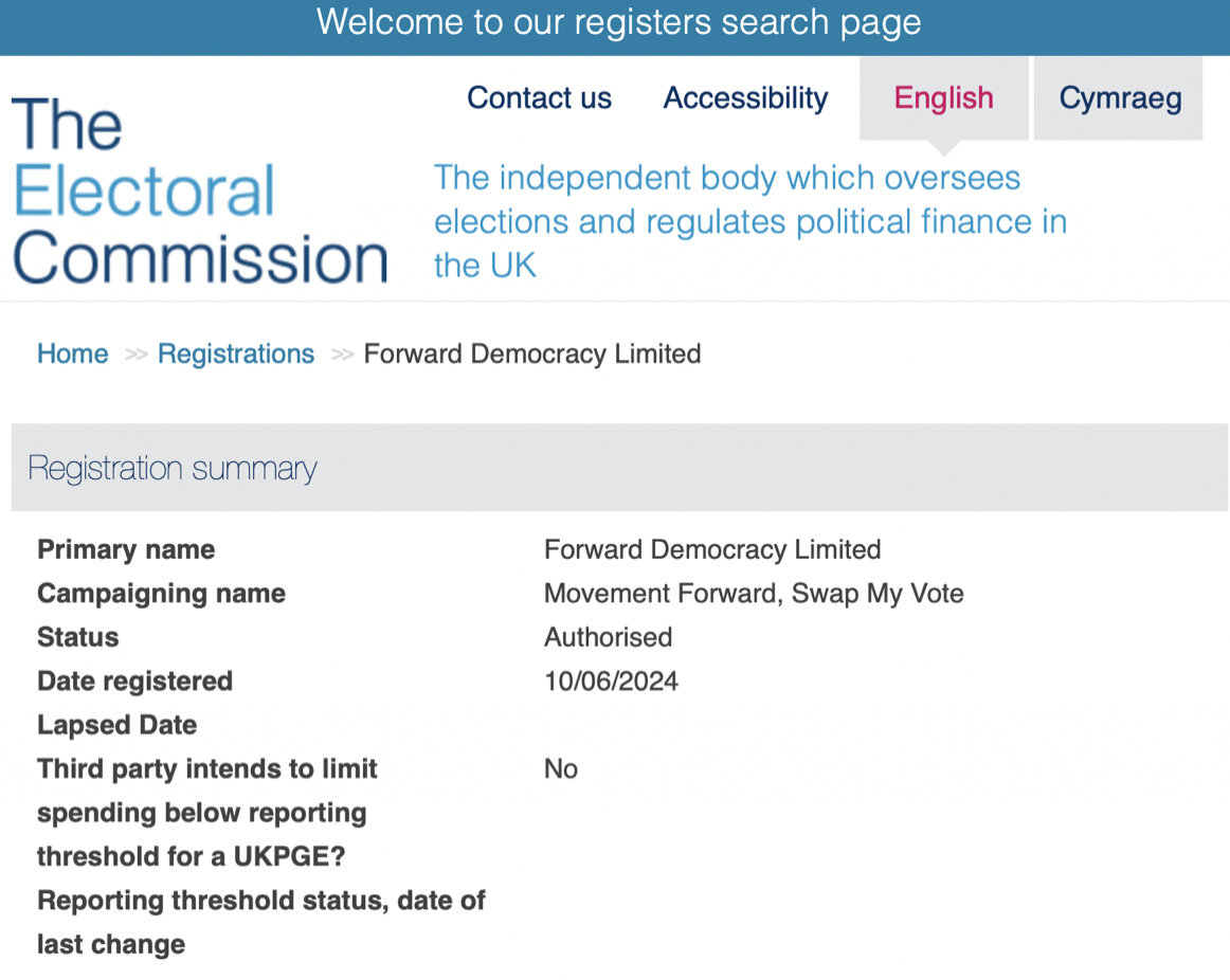 The big clue is the fact Vorderman is part of a group titled The Movement Forward (MVTFWD) (also titled Forward Democracy Limited and Swap My Vote, as you’ll see).