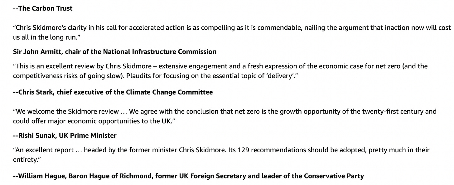 Two years later Skidmore launched The Independent Net Zero Review. He even turned it into a book which you can buy on Amazon for £11.39.