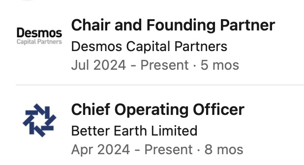 Anyway, soon after Skidmore departed government he took up a number of roles, such as being Chair and Founding Partner at Desmos Capital Partners and Chief Operating Officer of Better Earth Limited.