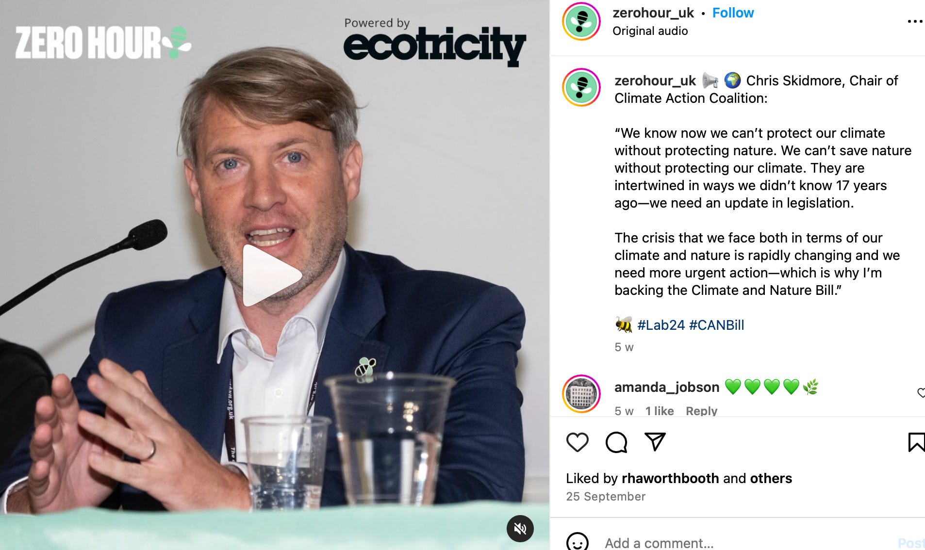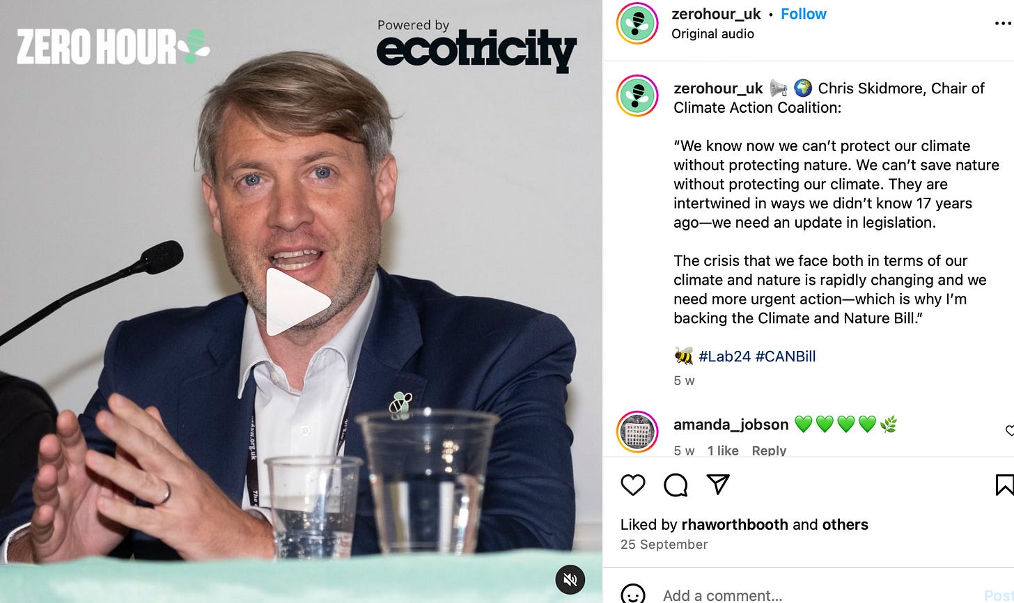 Skidmore and Vince spoke at a Zero Hour event “powered by Ecotricity” (Vince’s company):