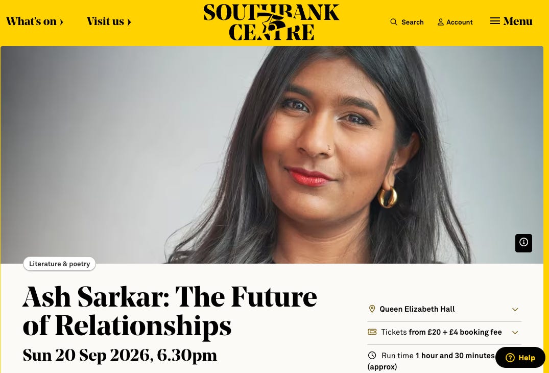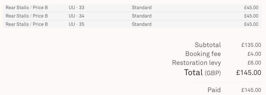 Never mind that the Southbank Centre charges people a “restoration levy” AND booking fee AND tries to add on £5 in donation to the Centre when you buy tickets. Behold, a screenshot of my lived experience below (I removed the £5 donation but had no other choice about the other bits):