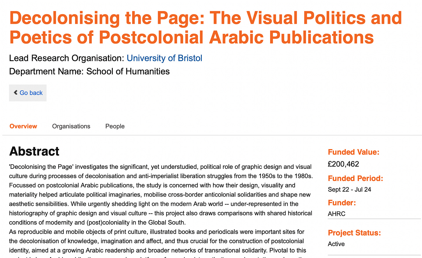 “It is the project's central contention that this rich archive enables us to recover a suppressed history and heritage of Arab decolonisation processes; one that takes on board the postcolonial imagination, aesthetic preoccupations and political contestations of Arab artists and designers of this generation. In doing so, 'Decolonising the Page' contributes to understanding histories of decolonisation: its thwarted projects and unfinished legacies resonate in renewed decolonial endeavours and solidarity projects today.”