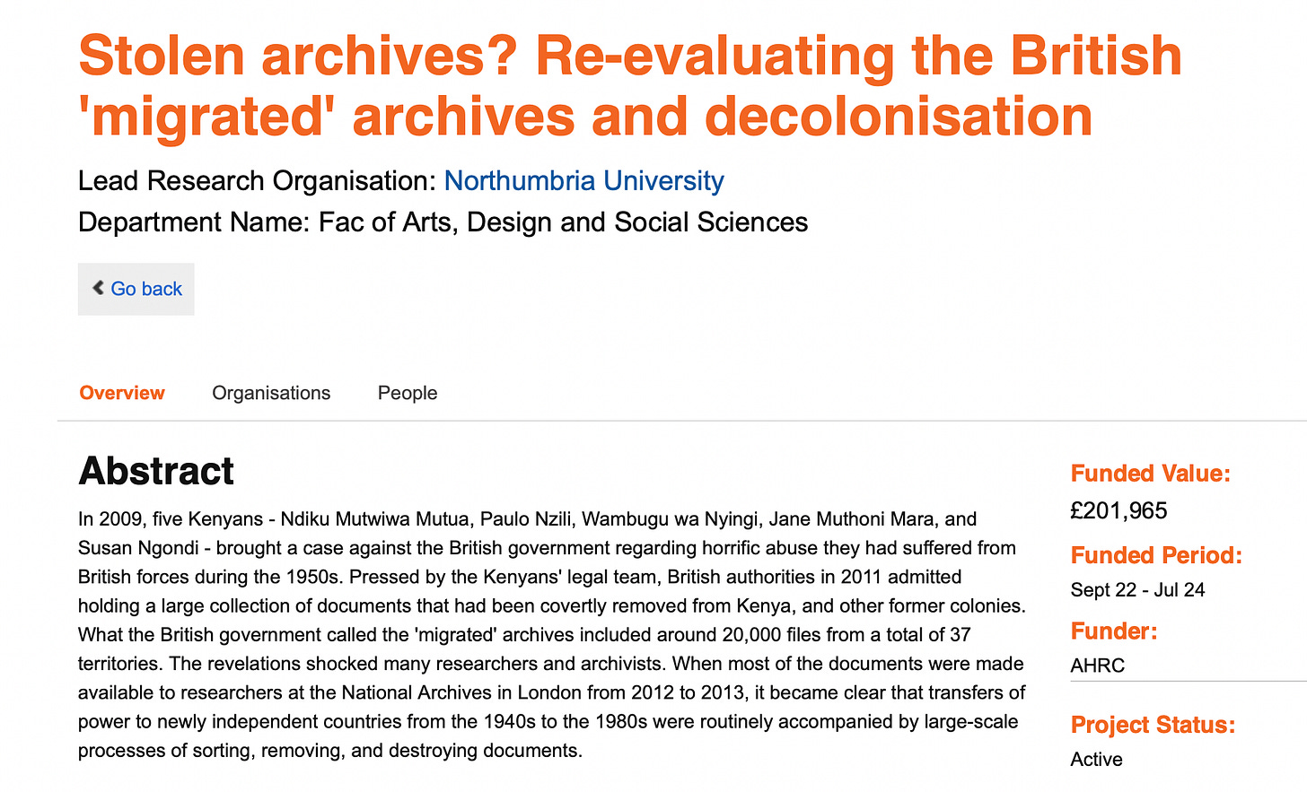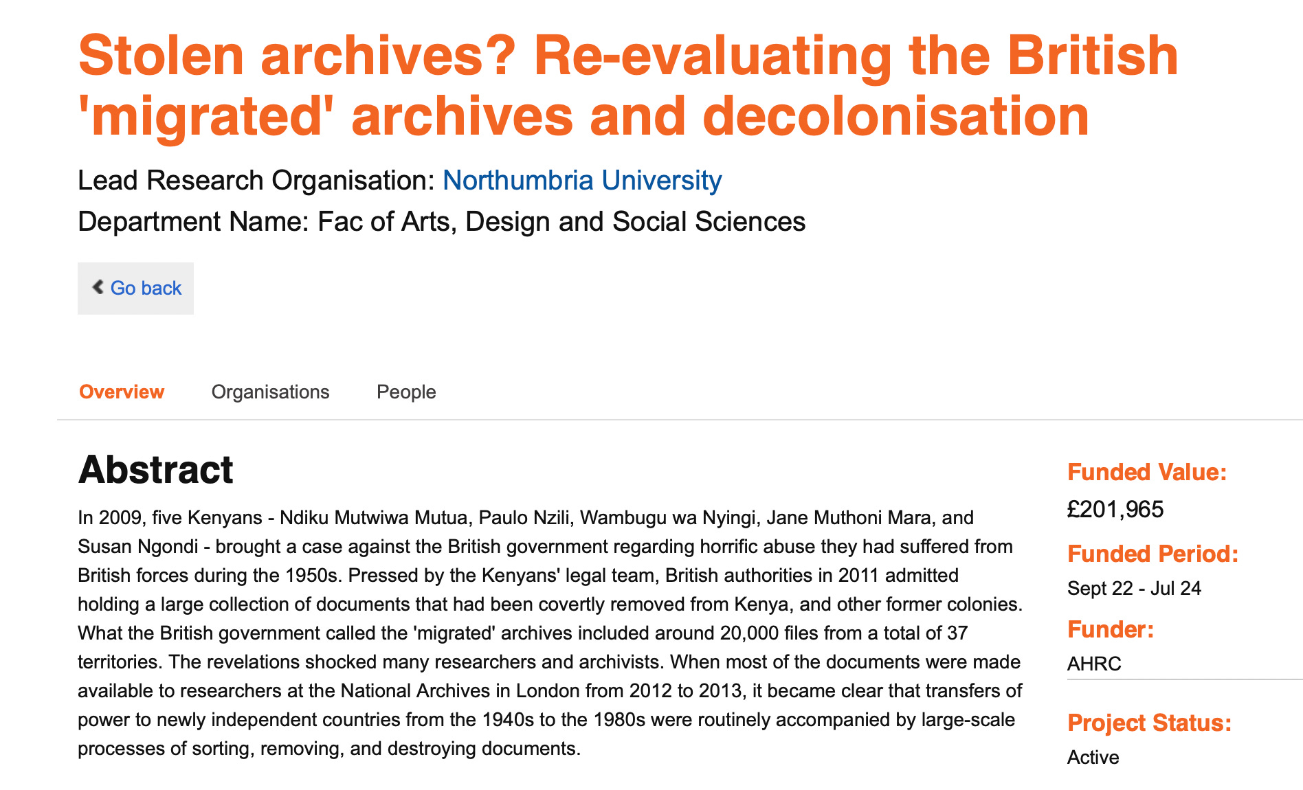 “The 'migrated' archives story is also rarely taught in British secondary schools, despite its importance in understanding decolonisation and its legacies for contemporary Britain. The project will facilitate the co-creation of new teaching resources for schools about the 'migrated' archives. A-level students will work as 'interns' on the project, collaborating with Northumbria University student mentors and school teachers to analyse 'migrated' documents. The project will co-create teaching resources that will generate new conversations among young people about decolonisation.”