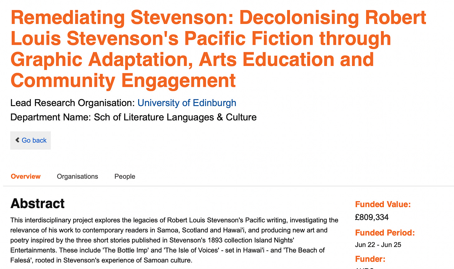 “Given that educational institutions throughout the world are actively engaged in decolonising their curricula, Stevenson's work and legacy present a particularly valuable focus of inquiry. Stevenson became actively involved in supporting Samoan and Hawaiian indigenous sovereignty movements at a crucial period just before these islands were annexed by the US and Germany, and yet his Pacific fiction, while iconoclastic in featuring indigenous protagonists with considerable agency and dignity, and offering a critical proto-modernist perspective on western imperialism, still upholds many of the colonial stereotypes typical of fin-de-siecle western literature.”