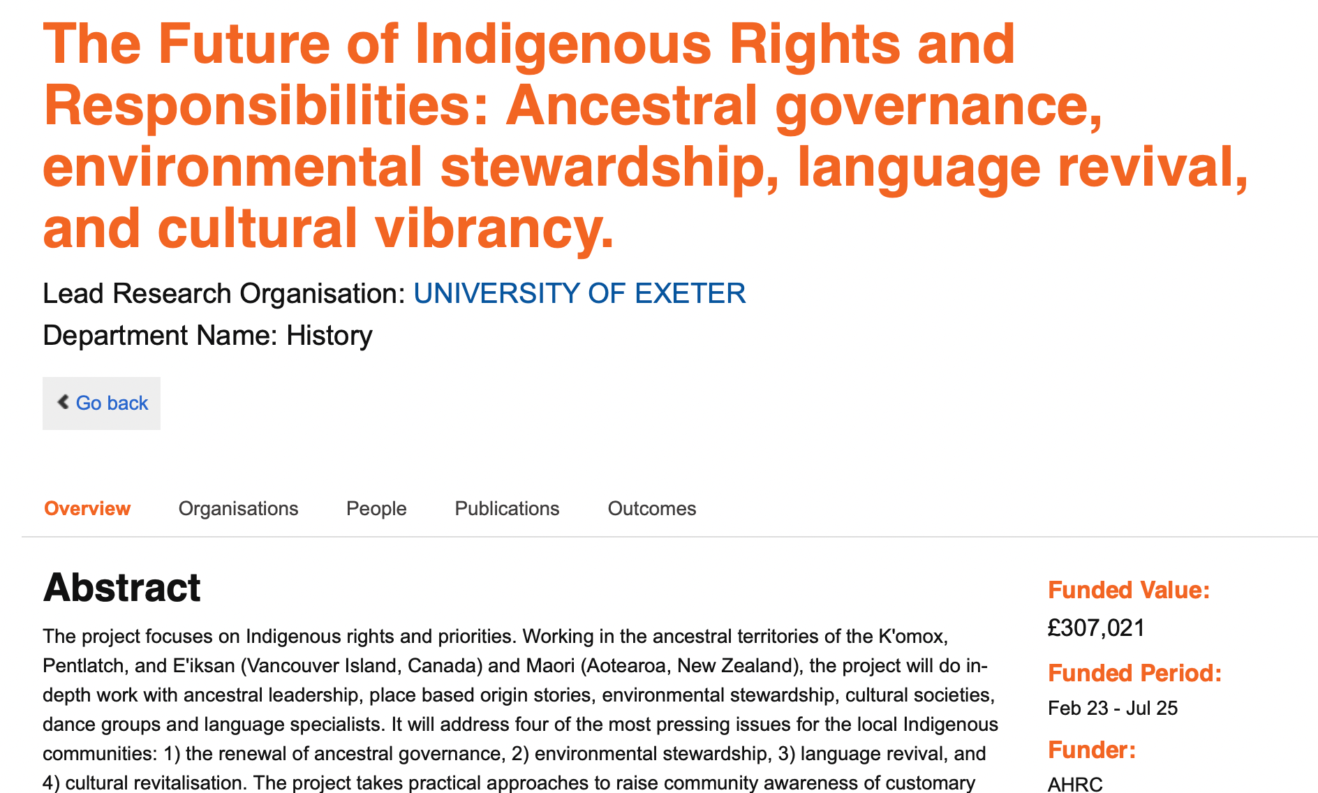 The project focuses on Indigenous rights and priorities. Working in the ancestral territories of the K'omox, Pentlatch, and E'iksan (Vancouver Island, Canada) and Maori (Aotearoa, New Zealand), the project will do in-depth work with ancestral leadership, place based origin stories, environmental stewardship, cultural societies, dance groups and language specialists.