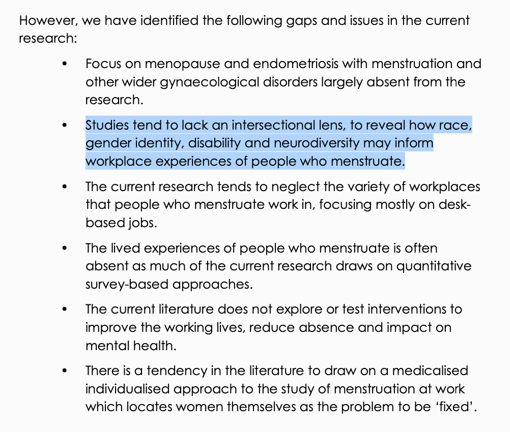Earlier in the year the EDICa released an entire report on the topic, which begins: “Studies tend to lack an intersectional lens, to reveal how race, gender identity, disability and neurodiversity may inform workplace experiences of people who menstruate.”