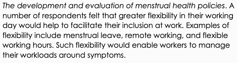 It recommends “Organisation wide menstrual health education programme and embed into institution wide equalities and health and safety initiatives”; “‘menstruation toolkit’ which brings together relevant policies, information, sources of support that should be available to all and appropriately communicated”; and the possibility of “menstrual leave”.