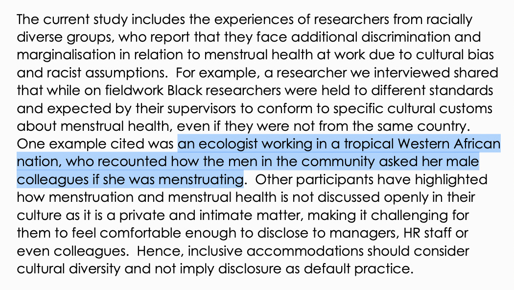 It even suggests that there’s period racism, warning that “Participants from racially diverse groups experience further marginalisation in relation to menstrual health at work due to cultural bias and racist assumptions”, giving the example of “an ecologist working in a tropical Western African nation, who recounted how the men in the community asked her male colleagues if she was menstruating.”