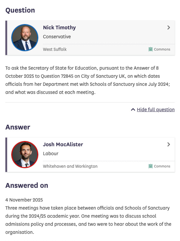 Conservative MP Nick Timothy recently asked Labourâs Secretary of State for Education âon which dates officials from her Department met with Schools of Sanctuary since July 2024; and what was discussed at each meeting.â