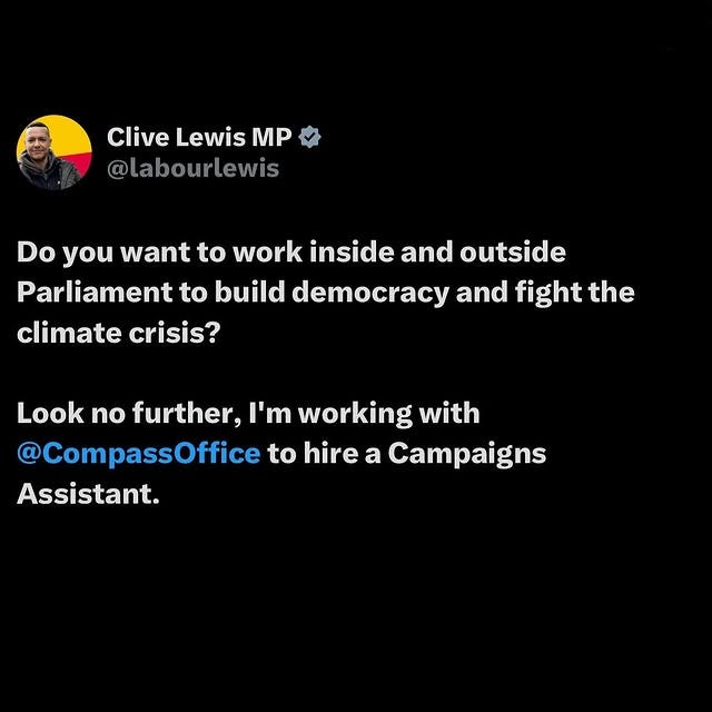 Photogenicity aside, I do think it’s just a little bit worrying that Lewis was hiring for a campaigns assistant with one of these mad activist groups, called Compass: