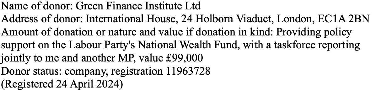 One was the £99,000 he received (*in value: see note at top) from the Green Finance Institute Ltd (GFI) seemingly in return for it “Providing policy support on the Labour Party's National Wealth Fund.” To add, the £99,000 is for Miliband and “another MP”, which appears to be Rachel Reeves (whose registered interests has the identical piece of text):