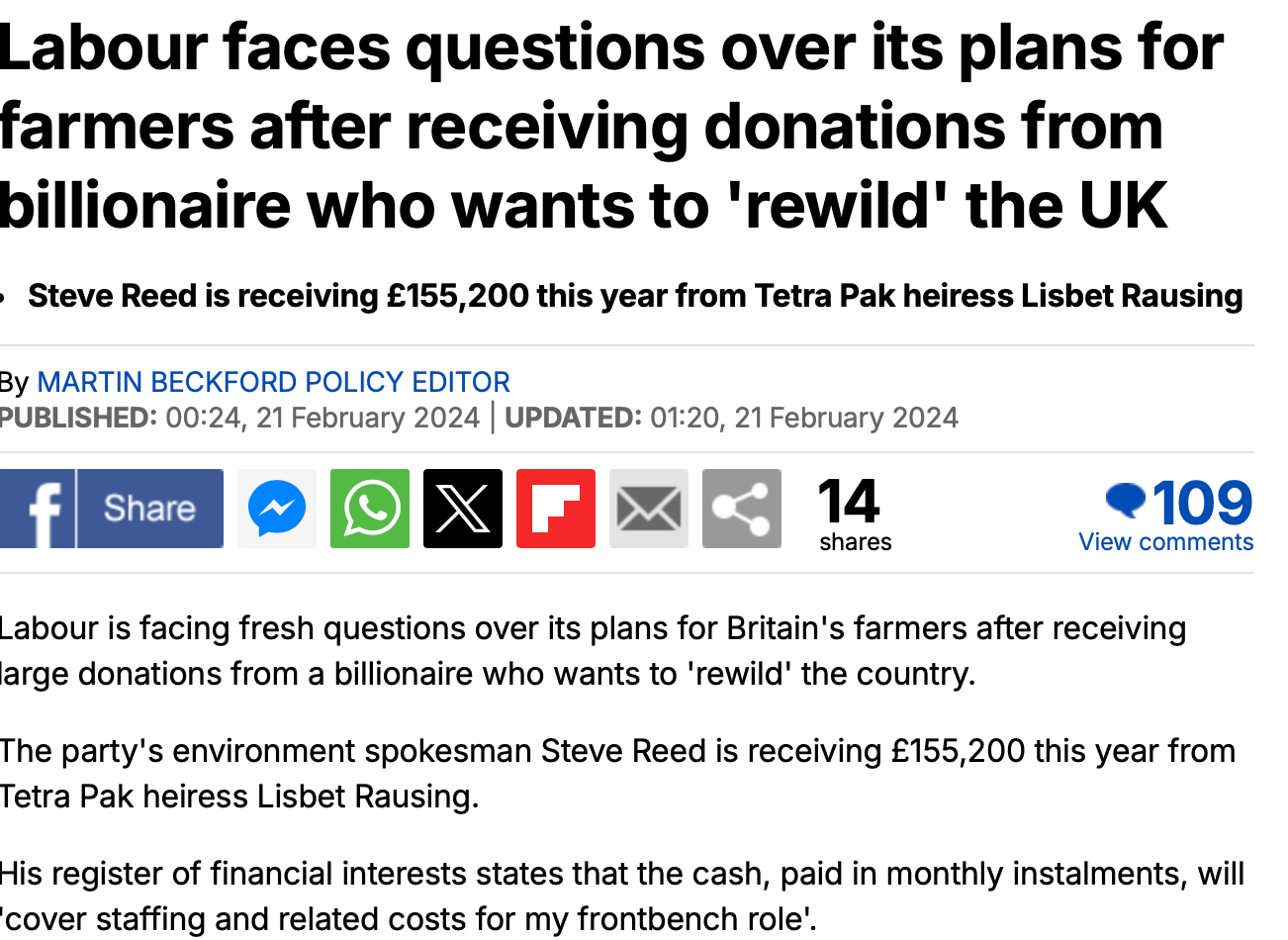In December 2023 it also found that Miliband received £233,600 from Rausing “to support his role as Labour's climate change and net zero spokesman.”