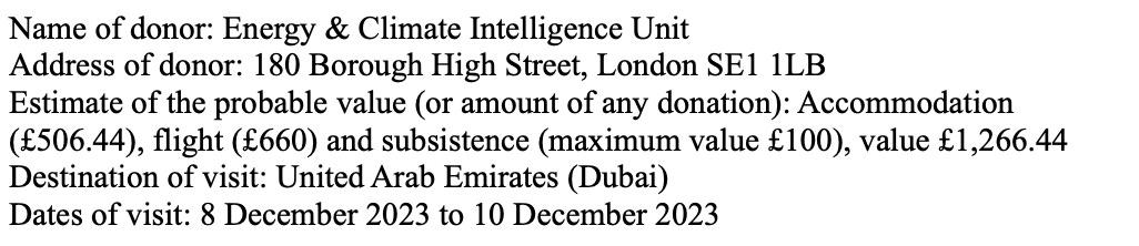 Anyway, this being said, when I opened up the register of interests, instead of hunting for “F” (Farage) I went to “M”: Miliband, the Secretary of State for Energy Security and Net Zero. Here I found A LOT. At the cheaper end of things, Miliband had his cars paid for by the United Arab Emirates during COP28 (just what you’d expect from an environmentalist). Then there were the big sums: