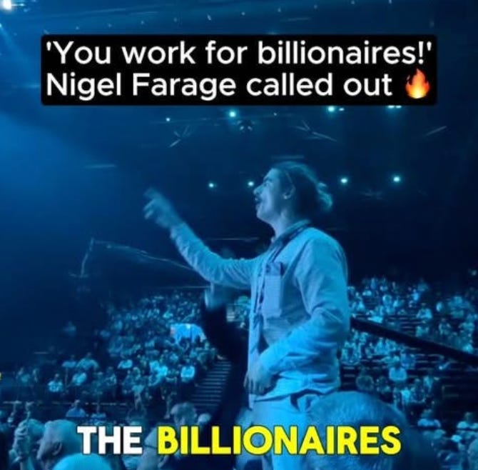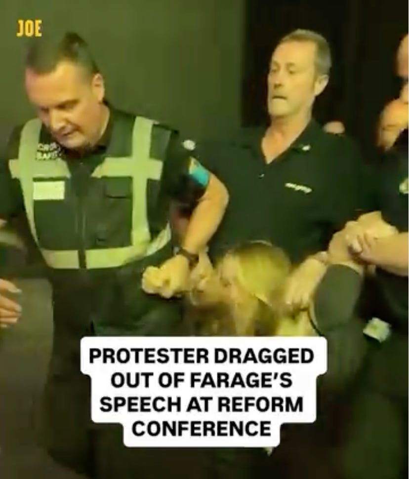 During Nigel Farage’s conference speech, a young man interrupted to shout out “Nigel, you are not a man of the people. You work for the billionaires”, while another woman from the same activist group was thrown out for being disruptive. Propaganda JOE was in perfect position to capture the moment: