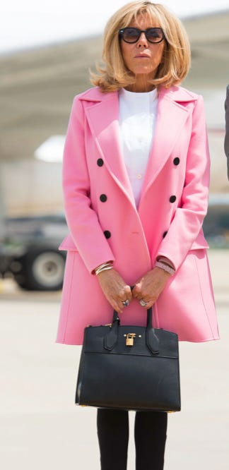 Here below Brigitte Macron can be seen in Washington D.C. (2018) wearing pink, and this is not the first sighting of her in the colour. It means she passes the first test of womanhood.