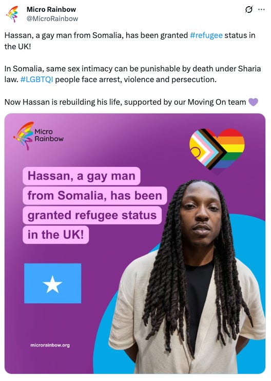 Yesterday an organisation titled Micro Rainbow celebrated the fact that āHassan, a gay man from Somaliaā had been granted refugee status in the UK.