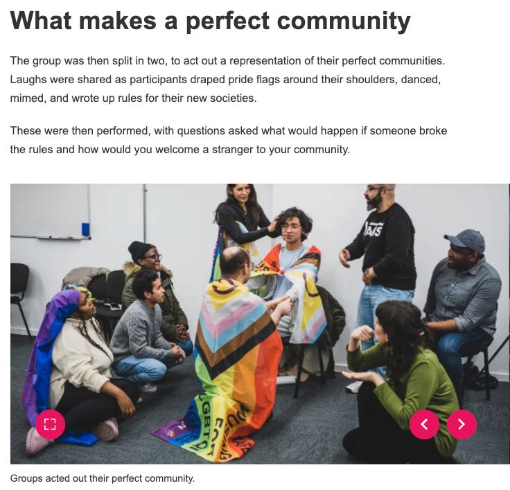 The webpage talked about how Micro Rainbow had run a ātheatre workshop with 18 LGBTQI asylum seekers and refugees, focused on the theme of community.ā