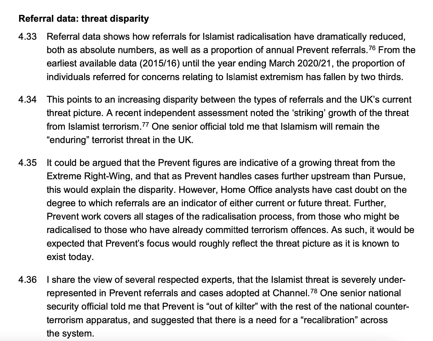 In 2021 the Home Office commissioned Sir William Shawcross to review Prevent, the report being released last year and coming to very different conclusions to Shukman (even though HOPE not hate has also been commissioned by the Home Office - so youād think theyād be fairly aligned in their assessment of terror threats).