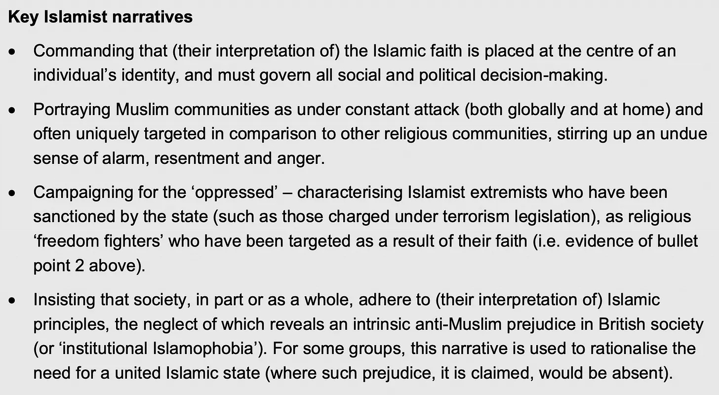 In parts of the report Shawcross even schools Prevent (supposedly the experts when it comes to extremism) on Islamist narratives: