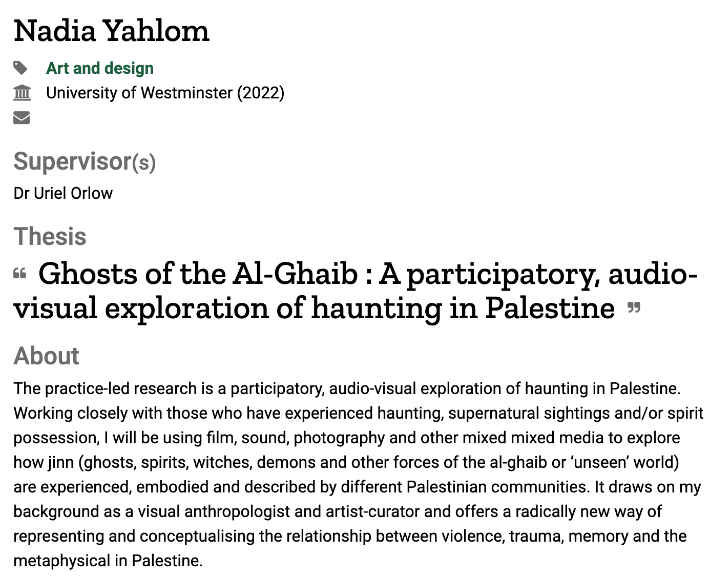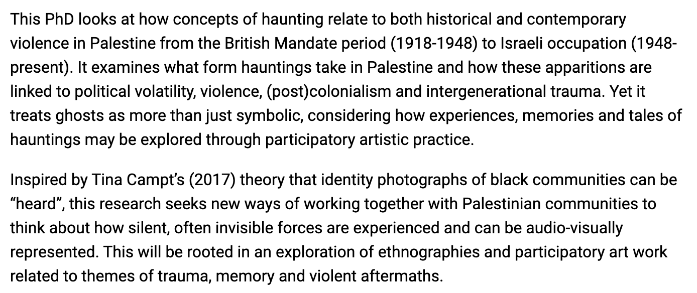 The practice-led research is a participatory, audio-visual exploration of haunting in Palestine. Working closely with those who have experienced haunting, supernatural sightings and/or spirit possession, I will be using film, sound, photography and other mixed mixed media to explore how jinn (ghosts, spirits, witches, demons and other forces of the al-ghaib or ‘unseen’ world) are experienced, embodied and described by different Palestinian communities. It draws on my background as a visual anthropologist and artist-curator and offers a radically new way of representing and conceptualising the relationship between violence, trauma, memory and the metaphysical in Palestine.