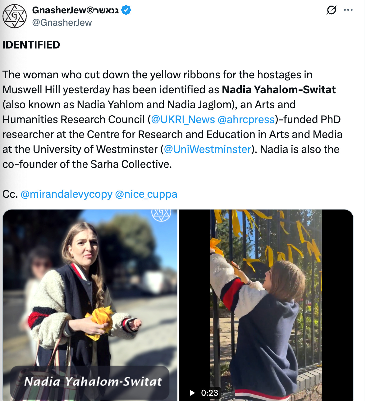 She has since been identified as Nadia Yahalom-Switat, a Palestinian-Jewish artist, and Arts and Humanities Research Council (AHRC)-funded PhD researcher, “also known as Nadia Yahlom and Nadia Jaglom”: