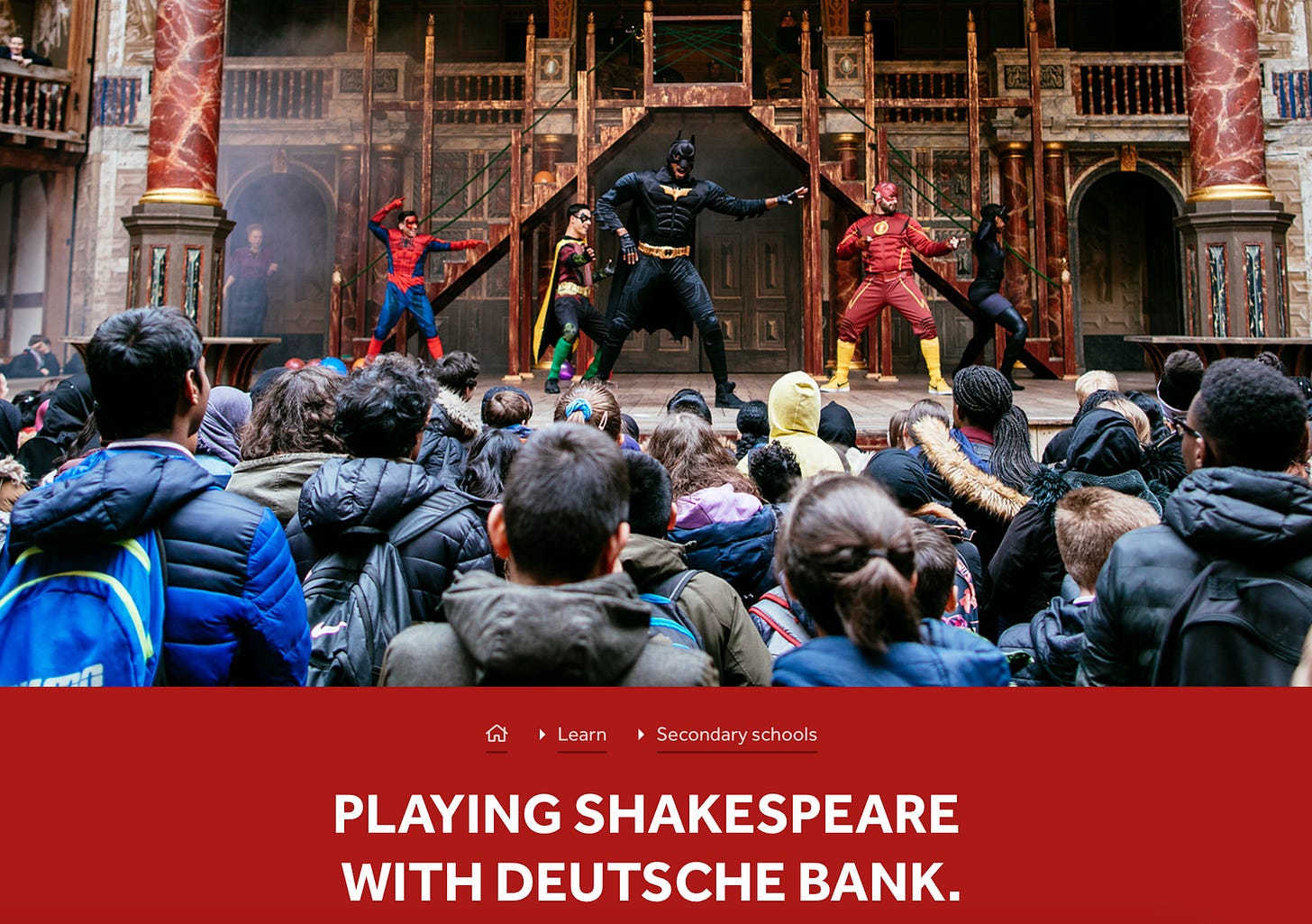 Deutsche Bank is also involved; it has a programme that “provides state secondary schools with free tickets to live performances at the Globe Theatre in London.” Here’s a picture of one of its programmes *shudders*: