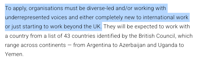 In reality, the British Council is a woke horror-show, as shown in its recent grant scheme only applicable to organisations that are “diverse-led and/or working with underrepresented voices and either completely new to international work or just starting to work beyond the UK.”