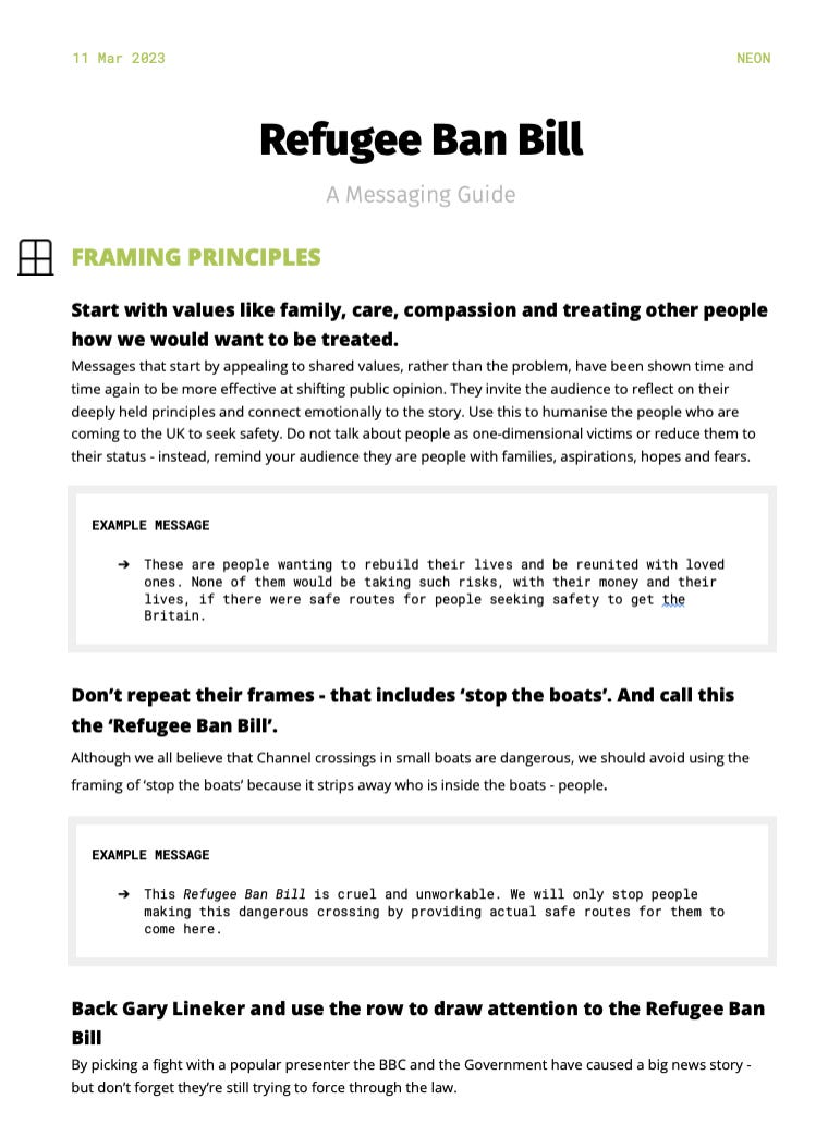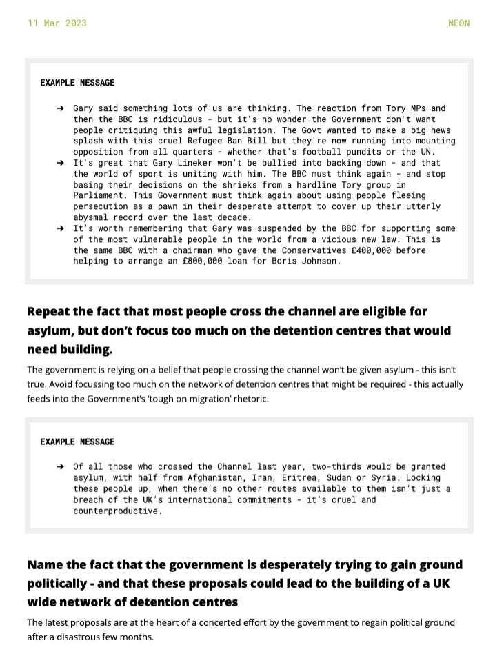 Playback speed×Share postShare post at current timeShare from 0:000:00/0:004825Left-wing activists were given scripts telling them to back Gary LinekerThe scripts were created in 2023 - after Lineker compared government asylum policy to living in 1930s GermanyCharlotte GillAug 26, 20254825ShareThis post is free to read. Support my research by taking out a subscription or making a donation on Buy Me a Coffee. Thank you to everyone who has funded my work.For paid subscribers:The Soros-funded media school for left-wing activistsCharlotte Gill·Jun 8Read full storyHow to be a wealth tax propagandistCharlotte Gill·Aug 23Read full storyHow taxpayers' money is being spent on "Sanctuary Cities"Charlotte Gill·Aug 20Read full storyNEON’s Script below:More:Left-wing activists are being given scripts for TVCharlotte Gill·Aug 24Read full storyDiscussion about this videoCommentsRestacksVIDEOSPolitical funding for dummies and other thoughts.Political funding for dummies and other thoughts.SubscribeAuthorsCharlotte GillRecent PostsWhy are taxpayers funding Nadia Yahlom’s PhD on ghosts? 12 hrs ago • Charlotte GillZarah Sultana's international socialismOct 6 • Charlotte GillGary Stevenson is part of a propaganda network for international socialismOct 1 • Charlotte GillWhy were British taxpayers charged £40 million for the Refugee Council? Sep 25 • Charlotte GillThe real reason Sadiq Khan and Donald Trump hate each other Sep 24 • Charlotte GillLabour are importing voters like you wouldn’t believeSep 20 • Charlotte GillWhy did the BBC refer to a Trump-hating Far Left activist as an "Immigration Researcher"?Sep 14 • Charlotte Gill“It’s Okay to Punch Nazis” posts anti-Trump activist groupSep 12 • Charlotte Gill