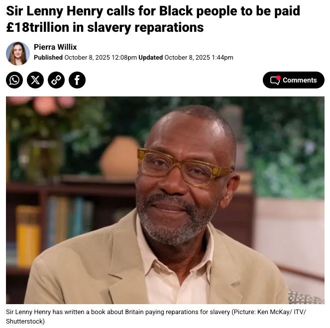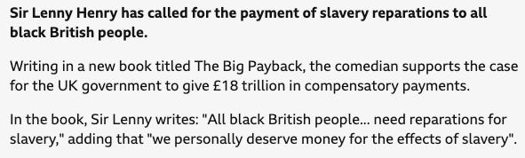 This week Parliament was graced with a special visitor; Lenny Henry, who thinks that the UK owes £18 trillion in slavery reparations: