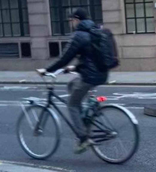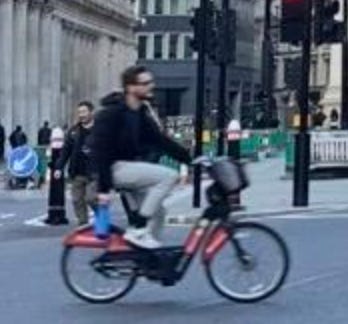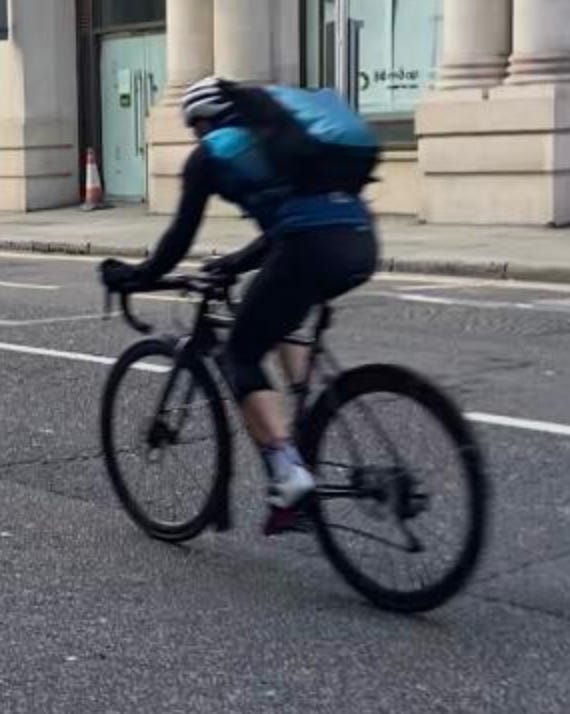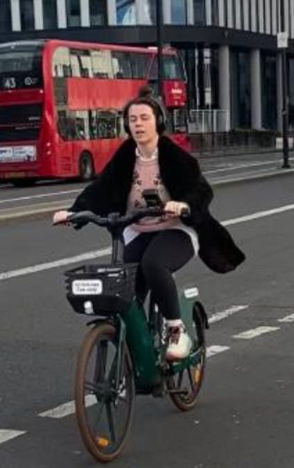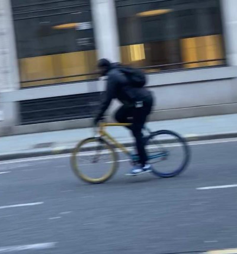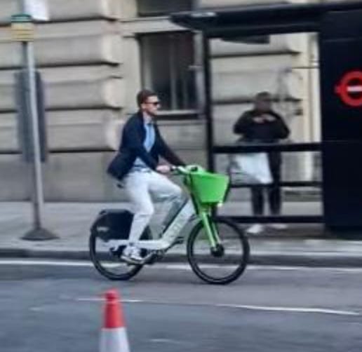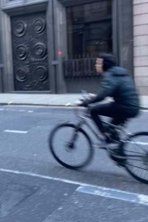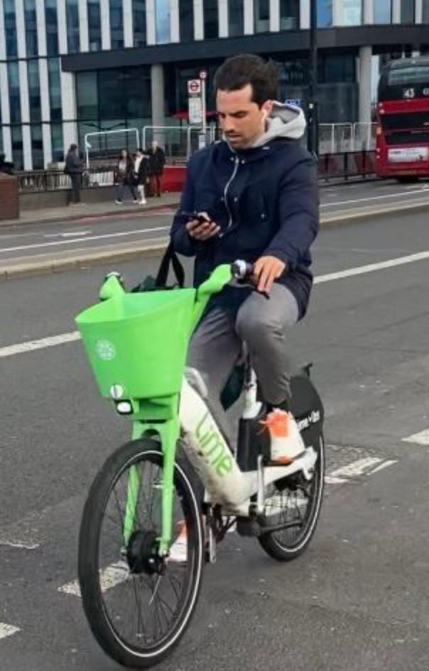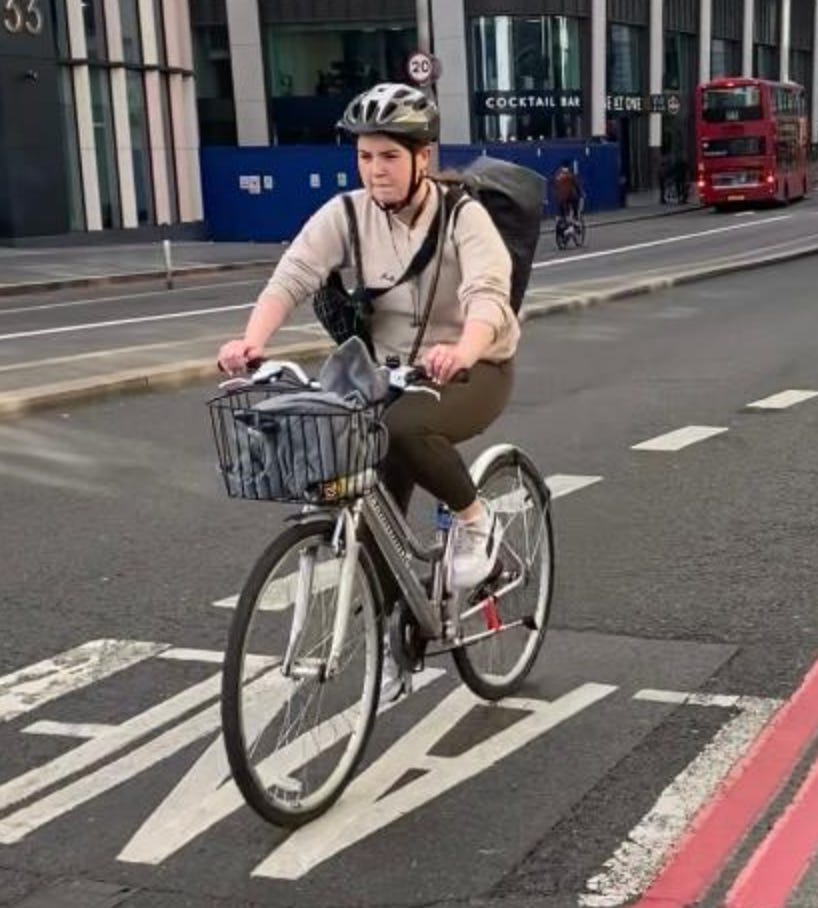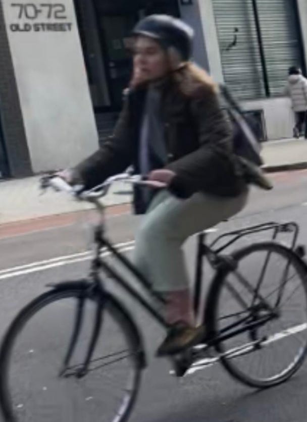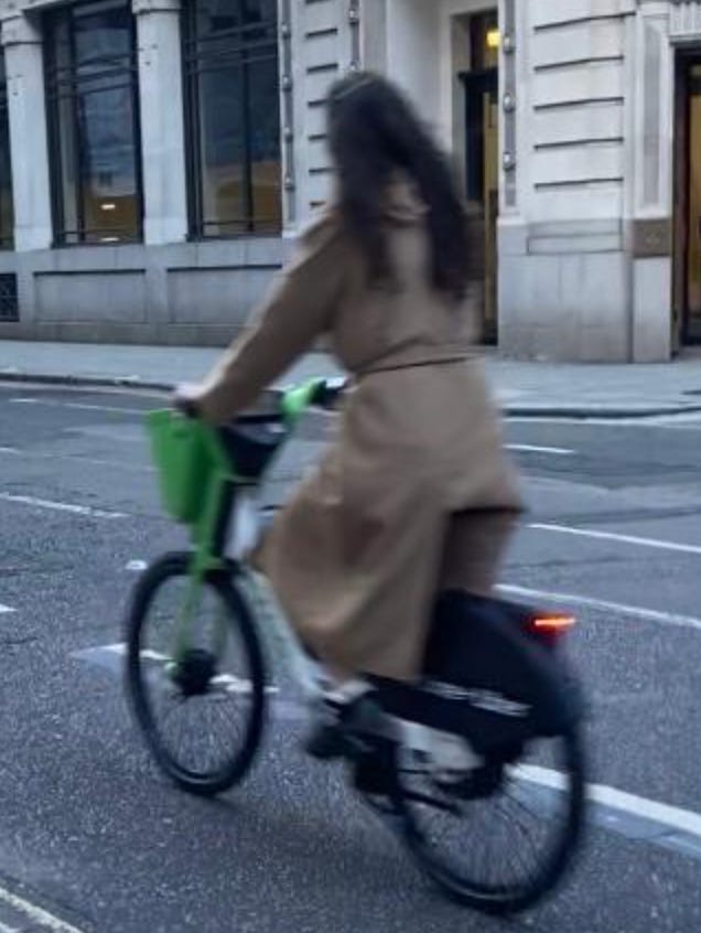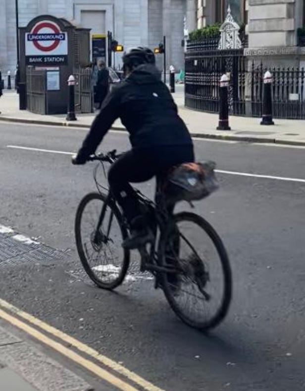 I walked from London Bridge to Barbican (approximately 1.6 miles) filming cyclists I saw on the way. While I aimed to film non-stop as much as I could, I paused several times to take photographs of parked Lime Bikes (as I document these on social media) and change my music (I am a fidgety DJ). I tried as best as possible to document every cyclist I could see. I discounted a handful in my study if their gender wasn’t clear-cut. For instance: