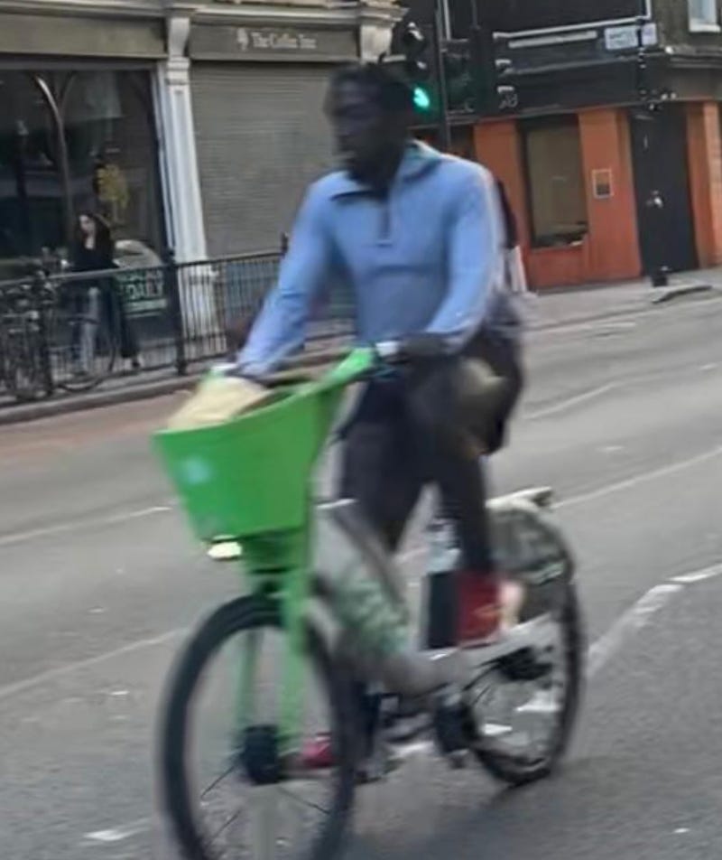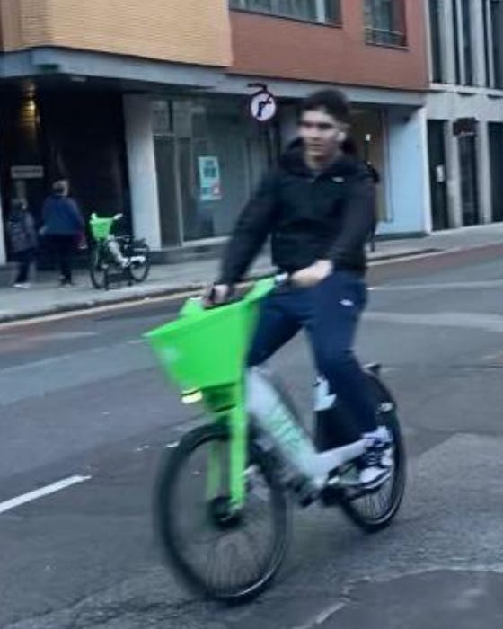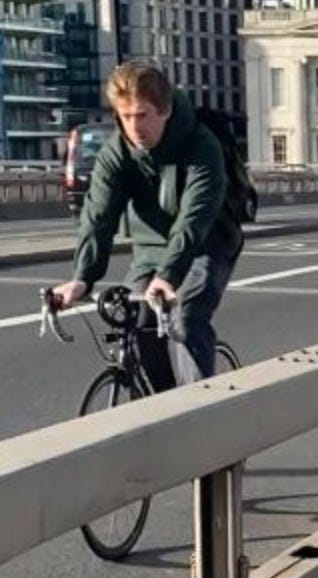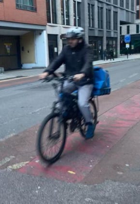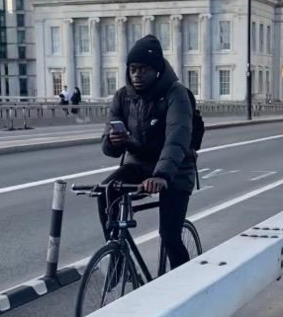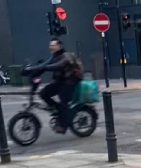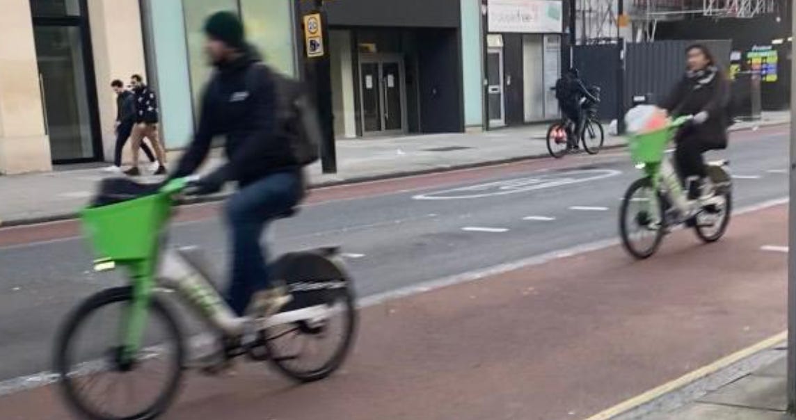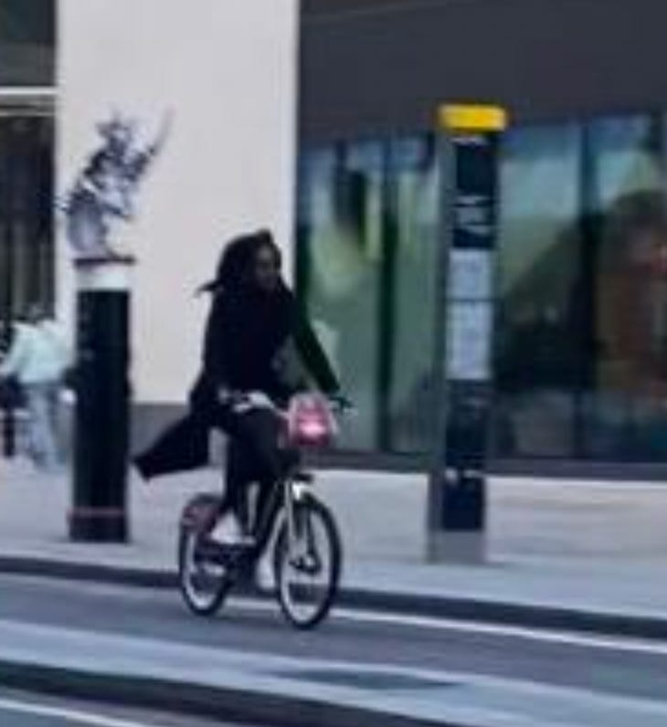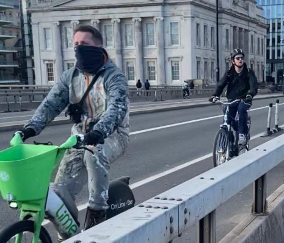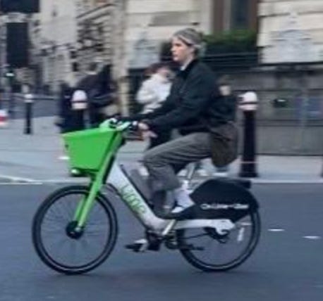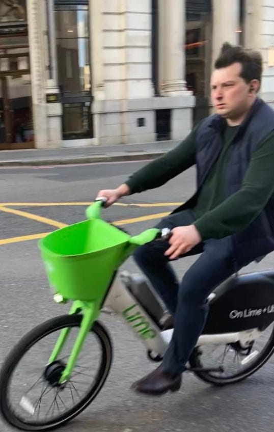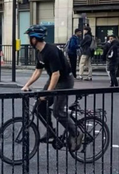 I walked from London Bridge to Barbican (approximately 1.6 miles) filming cyclists I saw on the way. While I aimed to film non-stop as much as I could, I paused several times to take photographs of parked Lime Bikes (as I document these on social media) and change my music (I am a fidgety DJ). I tried as best as possible to document every cyclist I could see. I discounted a handful in my study if their gender wasn’t clear-cut. For instance: