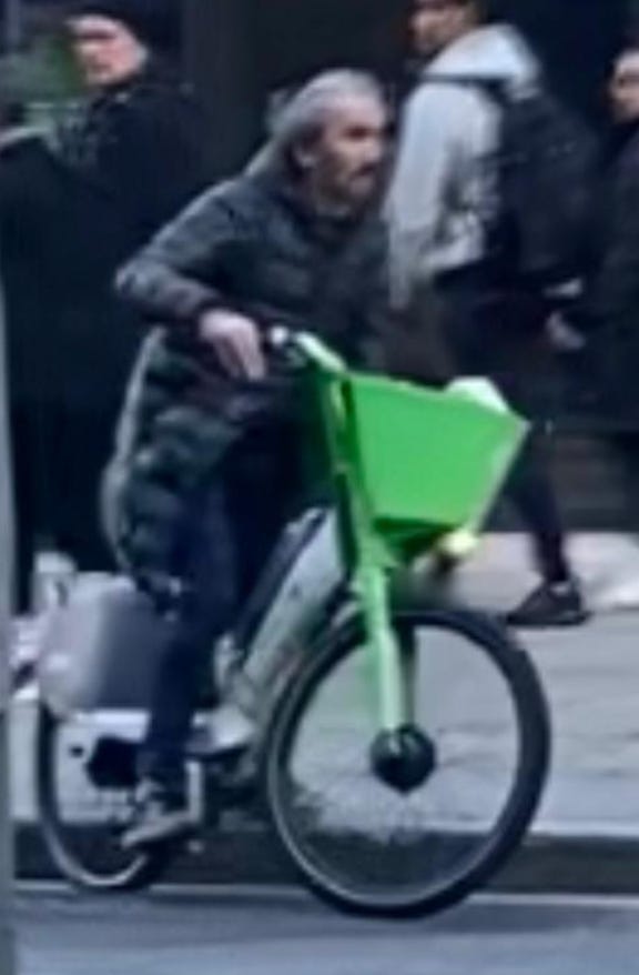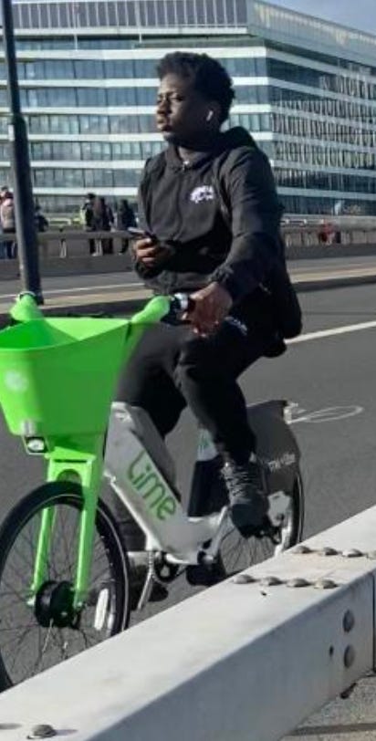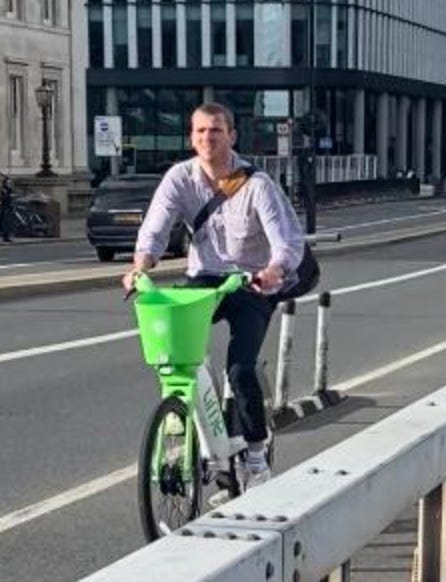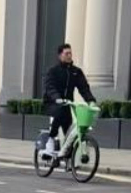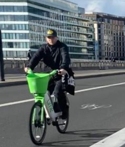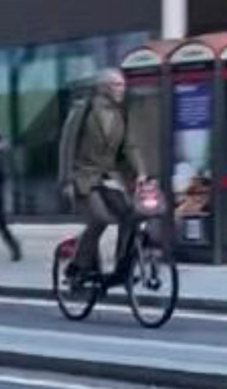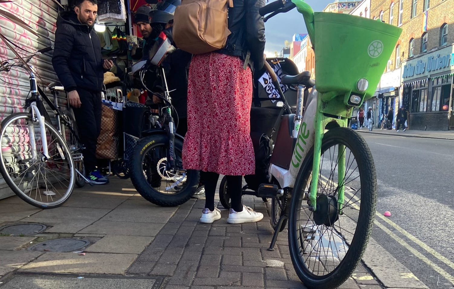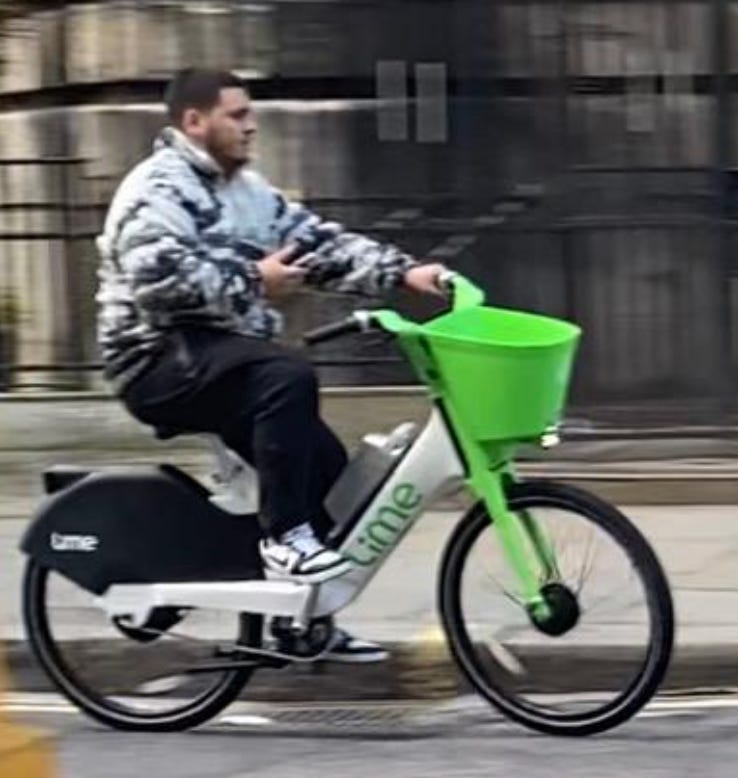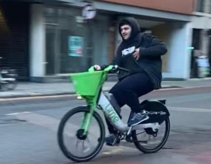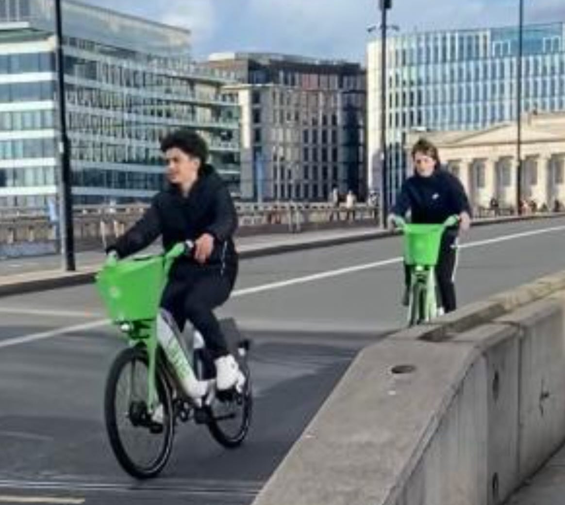 I walked from London Bridge to Barbican (approximately 1.6 miles) filming cyclists I saw on the way. While I aimed to film non-stop as much as I could, I paused several times to take photographs of parked Lime Bikes (as I document these on social media) and change my music (I am a fidgety DJ). I tried as best as possible to document every cyclist I could see. I discounted a handful in my study if their gender wasn’t clear-cut. For instance: