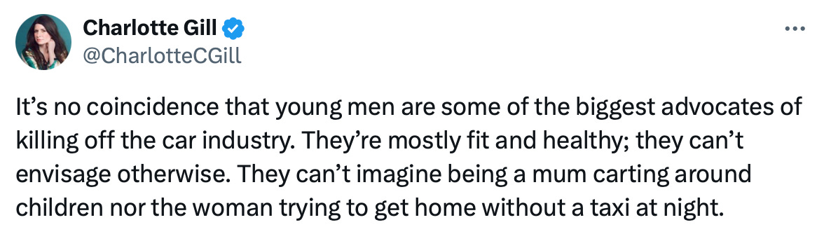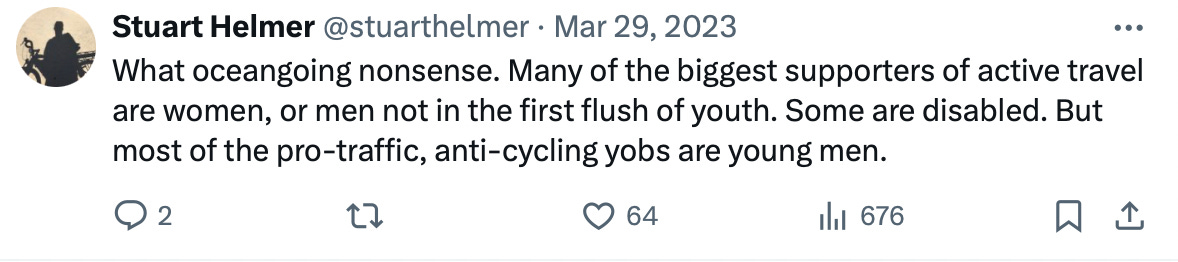 “What oceangoing nonsense. Many of the biggest supporters of active travel are women, or men not in the first flush of youth. Some are disabled. But most of the pro-traffic, anti-cycling yobs are young men.”