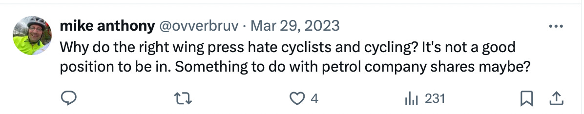 “Why do the right wing press hate cyclists and cycling? It's not a good position to be in. Something to do with petrol company shares maybe?”