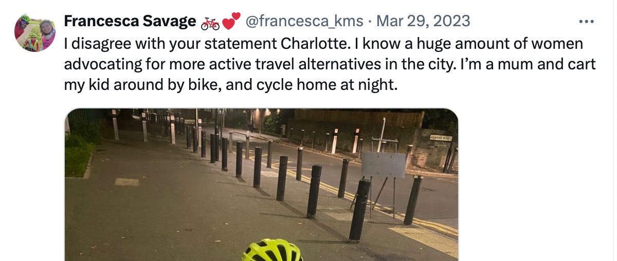 “I disagree with your statement Charlotte. I know a huge amount of women advocating for more active travel alternatives in the city. I’m a mum and cart my kid around by bike, and cycle home at night.”