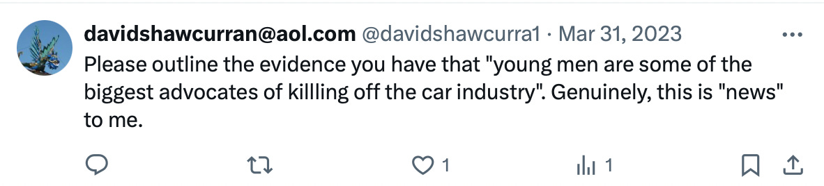 “Please outline the evidence you have that "young men are some of the biggest advocates of killling off the car industry". Genuinely, this is "news" to me.”