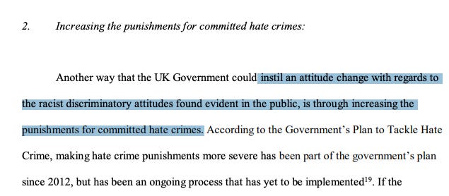 One report on its website, titled Deconstructing Racist Narratives and Discrimination in the United Kingdom, suggests the Government “could instil an attitude change with regards to the racist discriminatory attitudes found evident in the public… through increasing the punishments for committed hate crimes”…