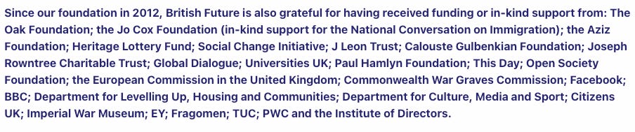 Funders of British Future, past and present, include the Paul Hamlyn Foundation, which (to reiterate) explicitly believes in open borders; the Open Society Foundations; and the Aziz Foundation (which funded the Ramadan lights in central London and is one part of the newly-formed, taxpayer-funded British Muslim Trust).