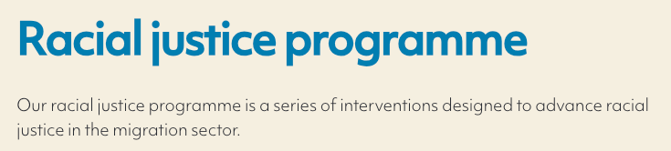 Justice Together is committed to “Racial Justice”, and has its own “Anti-Racist Advisory Group” and “racial justice programme” to “support the sustainability of organisations that are led by the global majority” and/ or “led by the global majority and carrying out racial justice work.”