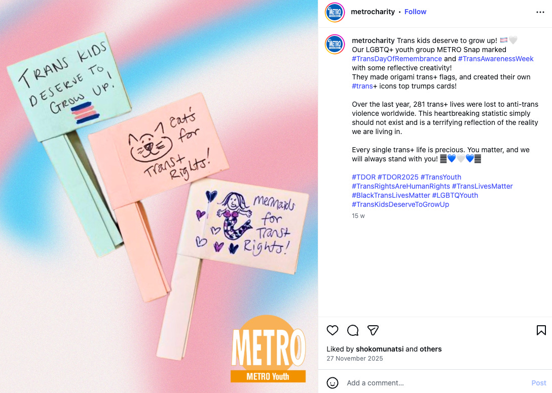 “Talk all things wellbeing and intersectionality” reads the Instagram post of METRO Charity, in an advert for its “free mental health support group for LGBTQ+ Black POC and mixed-race (global majority) people in Lewisham.” Another post reads “Trans kids deserve to grow up!” and explains how METRO Charity’s “LGBTQ+ youth group” marked Trans Day of Remembrance and Trans Awareness Week by making “origami trans+flags” and "trans+ icons top trump cards”.